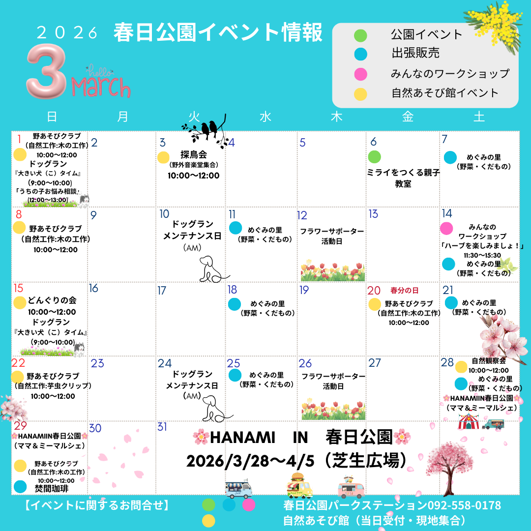 3月のイベント情報です。この時期は園内が大変混雑します。駐車場ご利用の際はマナーを守り、無理な駐車をなさらないようお願いいたします。春日公園のマナーアップにご協力下さい。