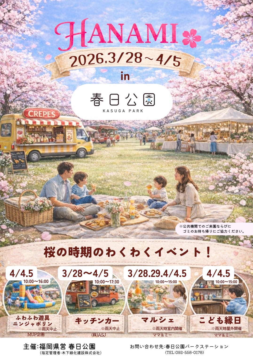 子どもも大人も笑顔になる桜の時期のわくわくイベントを開催いたします!キッチンカー・マルシェ・ふわふわ遊具・縁日など一日中楽しめます。ぜひ遊びにお越しください。 駐車場ご利用の際はマナーを守り、無理な駐車をなさらないようお …