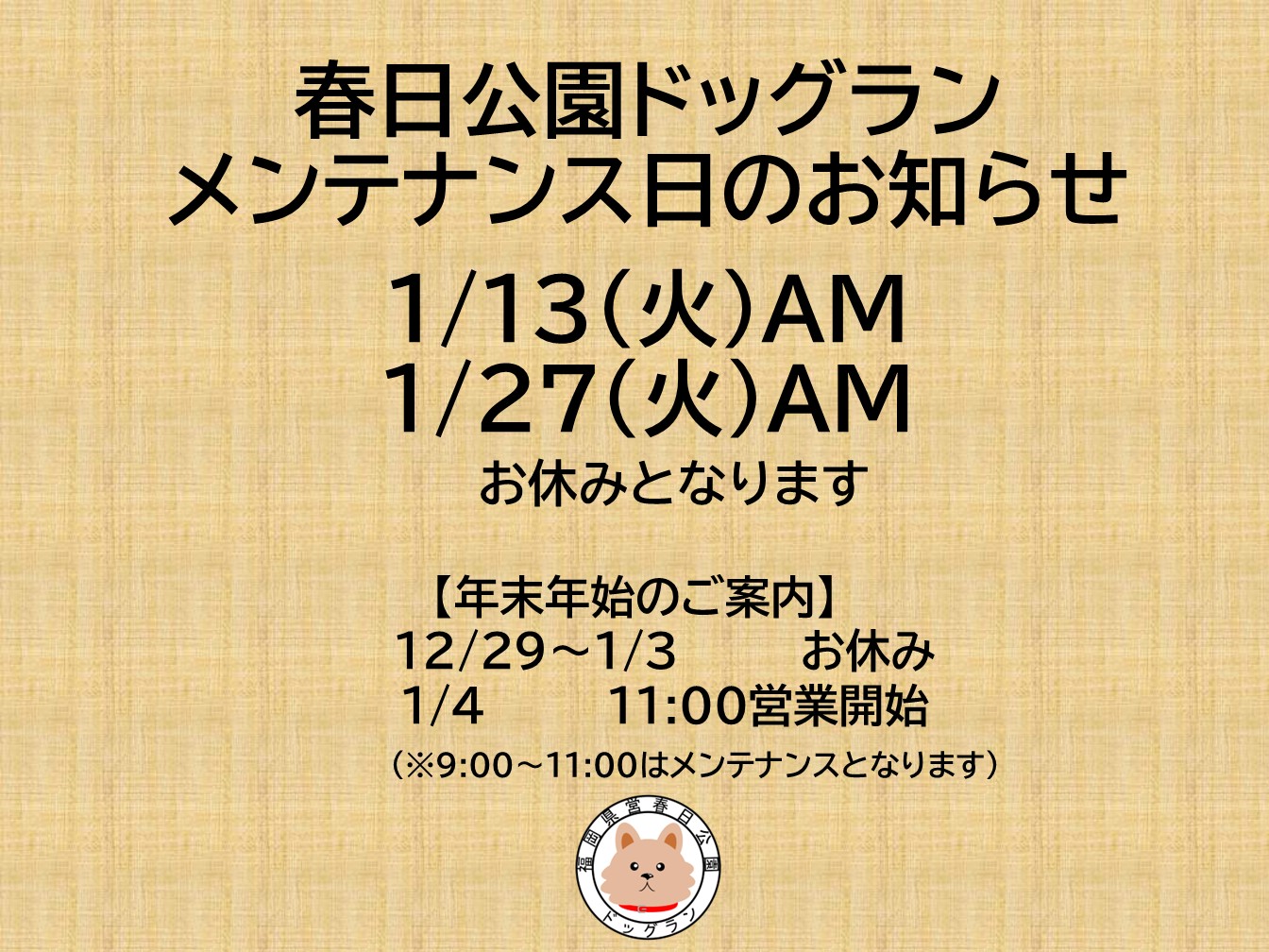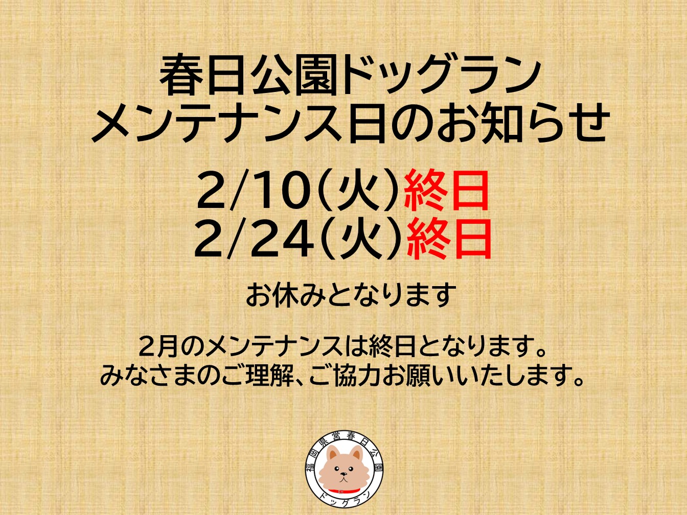 令和8年2月ドッグランメンテナンス日のお知らせ