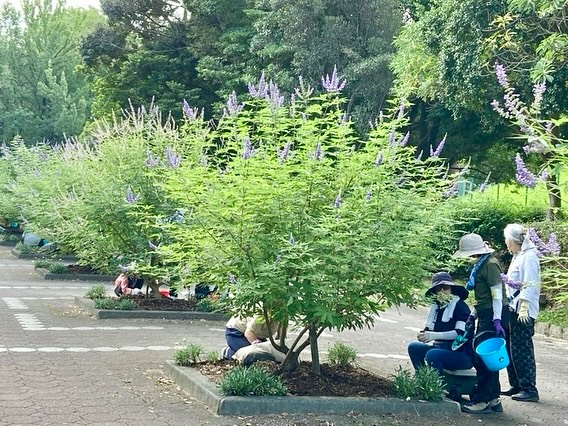 花壇ボランティアのフラワーサポーターさんが西洋ニンジンボクの下に水仙の球根を植えました。